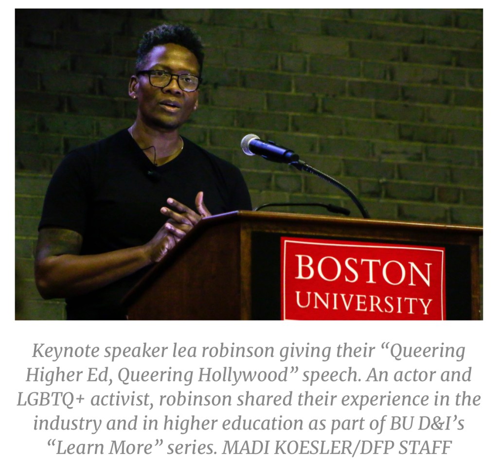 “lea’s visit had a profound impact on the BU community, not just with their keynote remarks but also with the way they held space for and with others –by being deeply present, authentic, vulnerable, and intentional. Their ability to humanize and draw parallels between their journeys queering higher ed and queering Hollywood made for powerful storytelling. lea is also a rare kind of truth-teller; whether in a large ballroom or a small reception space, they bring a warmth that centers QTBIPOC people and invites broad audiences to engage with uncomfortable truths.”