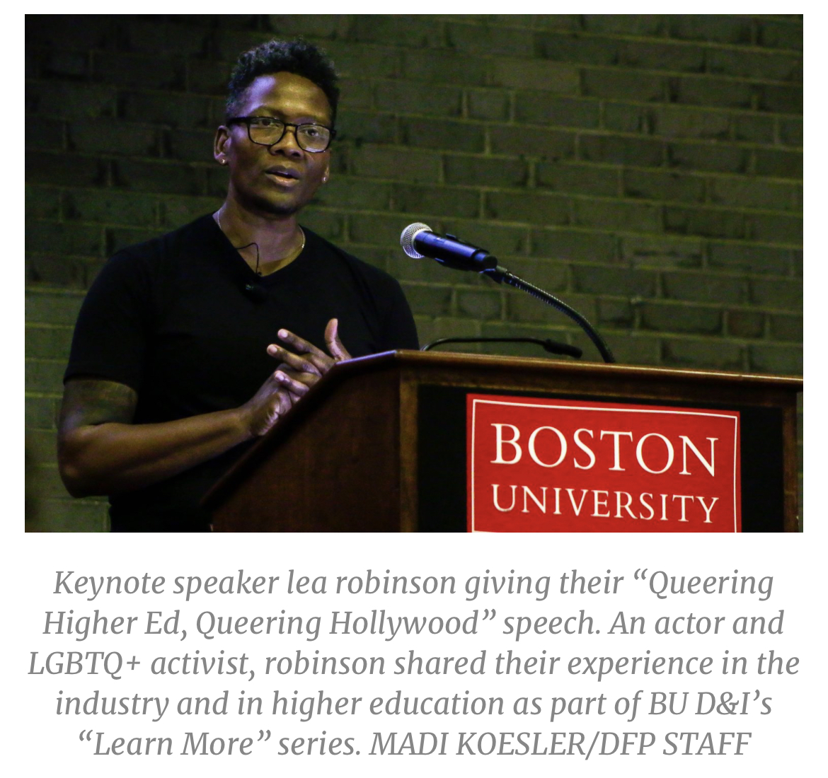 “lea’s visit had a profound impact on the BU community, not just with their keynote remarks but also with the way they held space for and with others –by being deeply present, authentic, vulnerable, and intentional. Their ability to humanize and draw parallels between their journeys queering higher ed and queering Hollywood made for powerful storytelling. lea is also a rare kind of truth-teller; whether in a large ballroom or a small reception space, they bring a warmth that centers QTBIPOC people and invites broad audiences to engage with uncomfortable truths.”